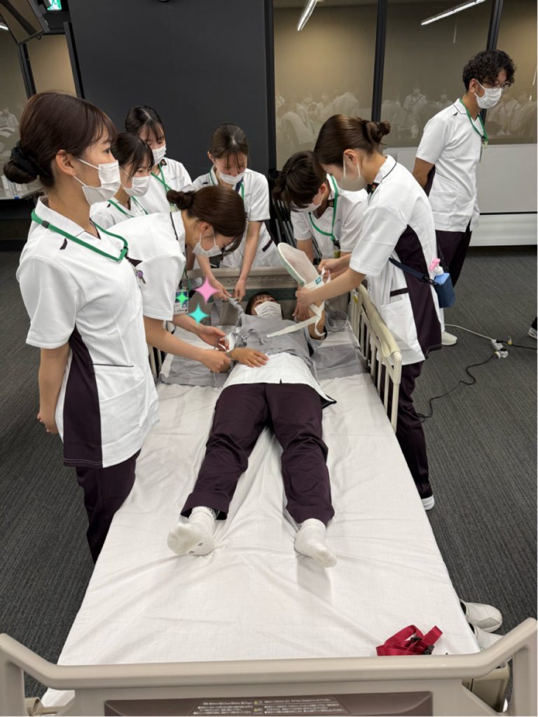 ストレッチャーへの移乗移送や、実際に身体拘束をされる患者役の経験をしました。